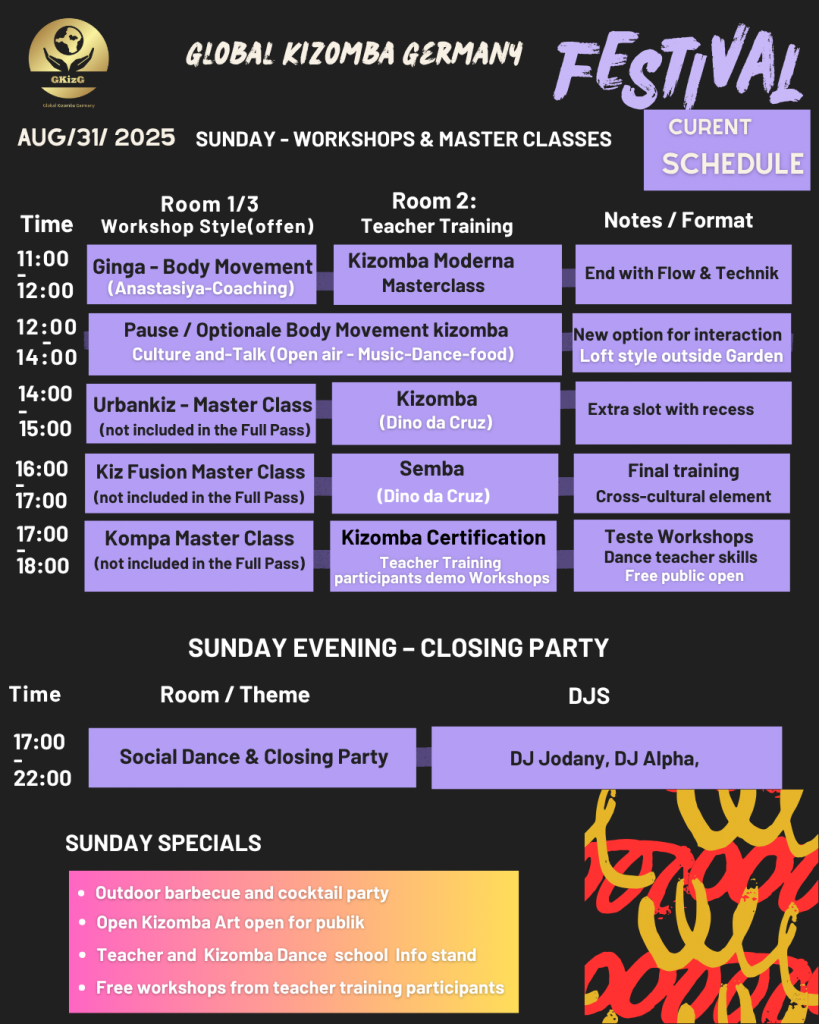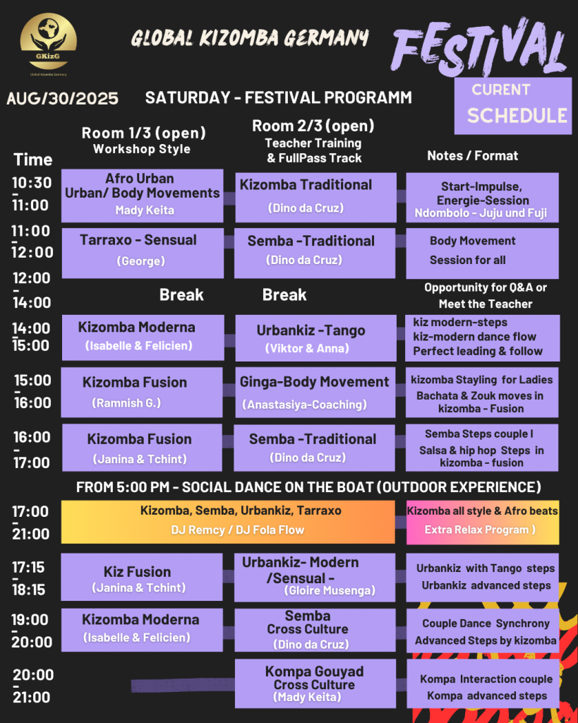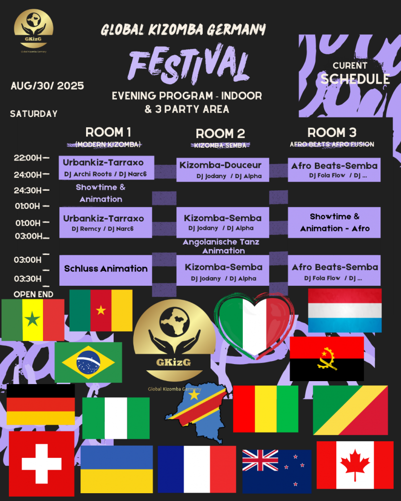 Willkommen zur ersten Global Kizomba Germany, einem einzigartigen Festival, das die gesamte Bandbreite der Kizomba-Welt repräsentiert! Egal ob Semba, Kizomba, Urbankiz, Fusion, Tarraxo oder Kompa – hier lernst du die Essenz, Kultur und Entwicklung dieses faszinierenden Tanzes von den besten internationalen und nationalen Künstlern.